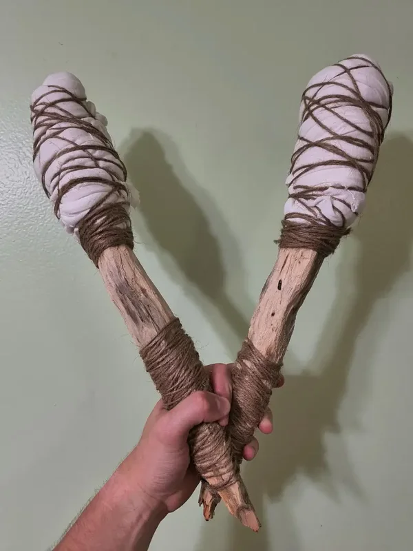Variable in size, handmade Wooden Torches! Comfortable to hold. Can be used as props or soaked in a flammable liquid and used for camping, larping, or general recreation!
